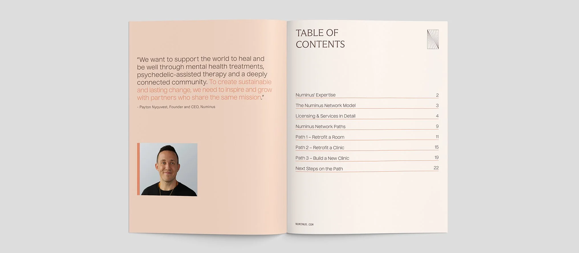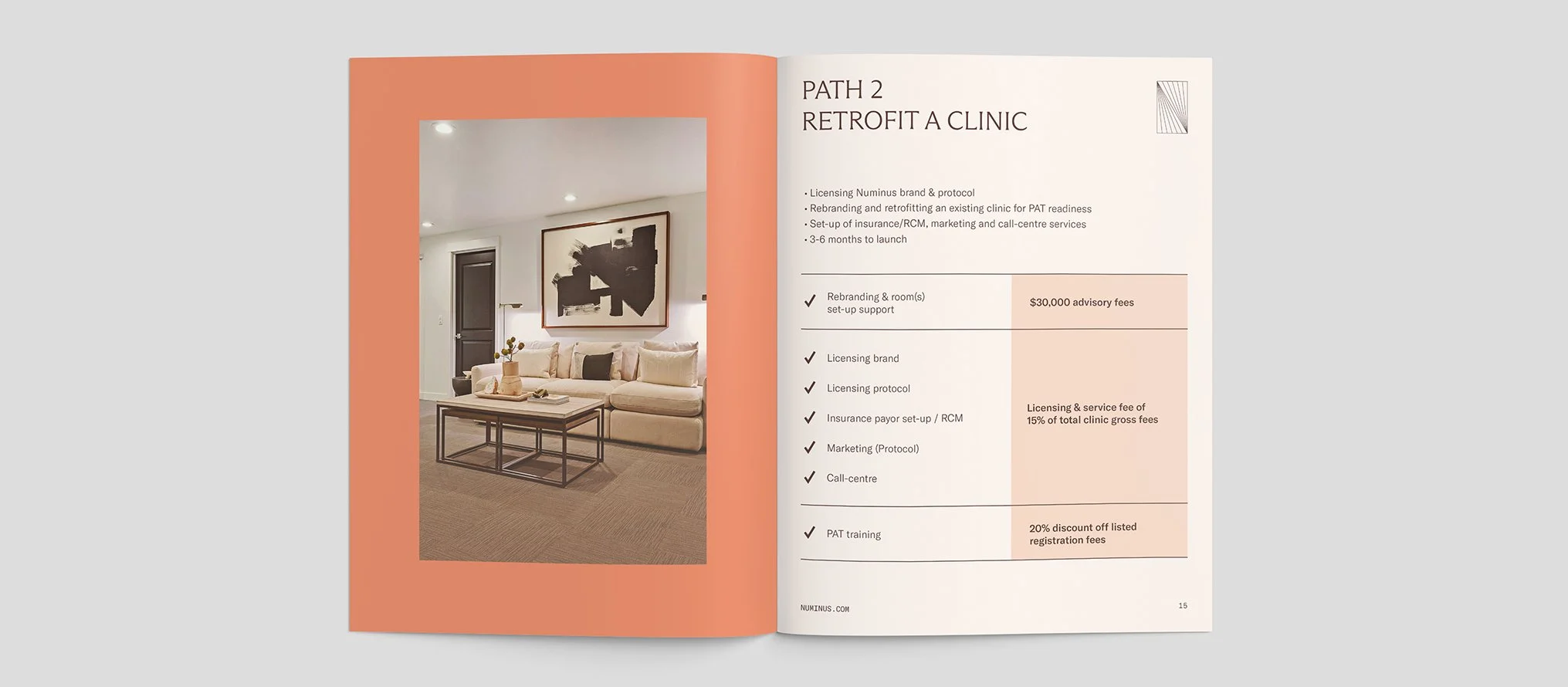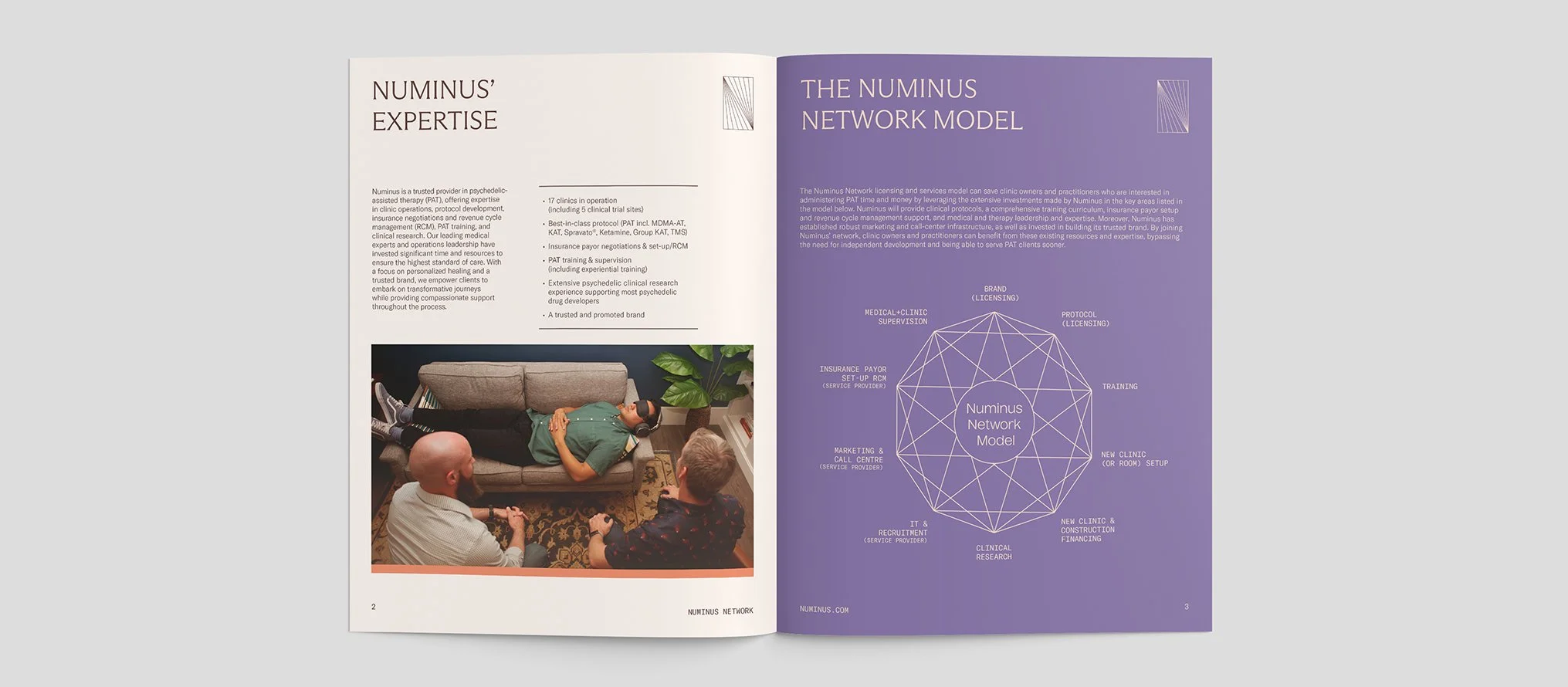 A guidebook created for clinic owners and practitioners interested in partnering with Numinus. The guidebook needed to represent the Numinus brand while also appealing to practitioners. This was achieved by incorporating visually engaging colour pops using the brand's vibrant palette, balanced with clean, editorial layouts to maintain a professional and approachable tone.