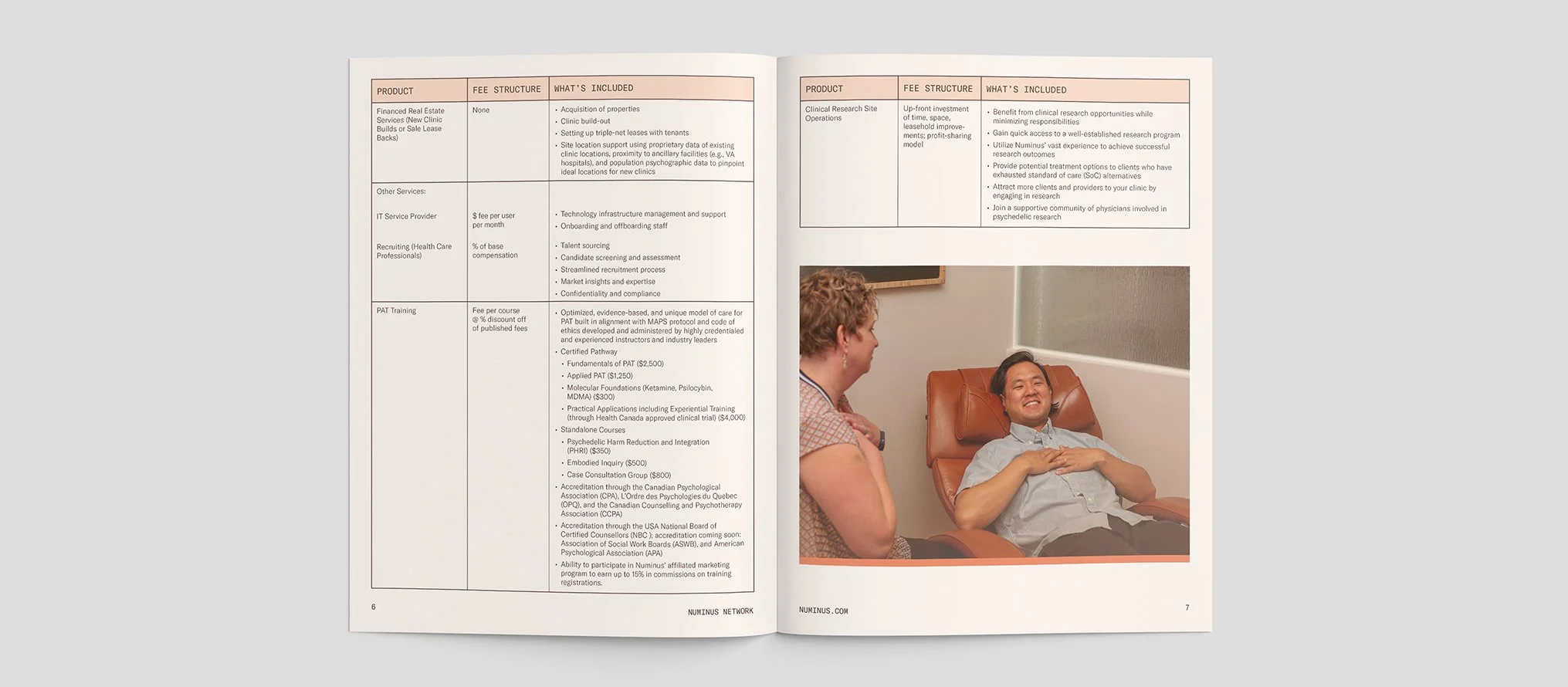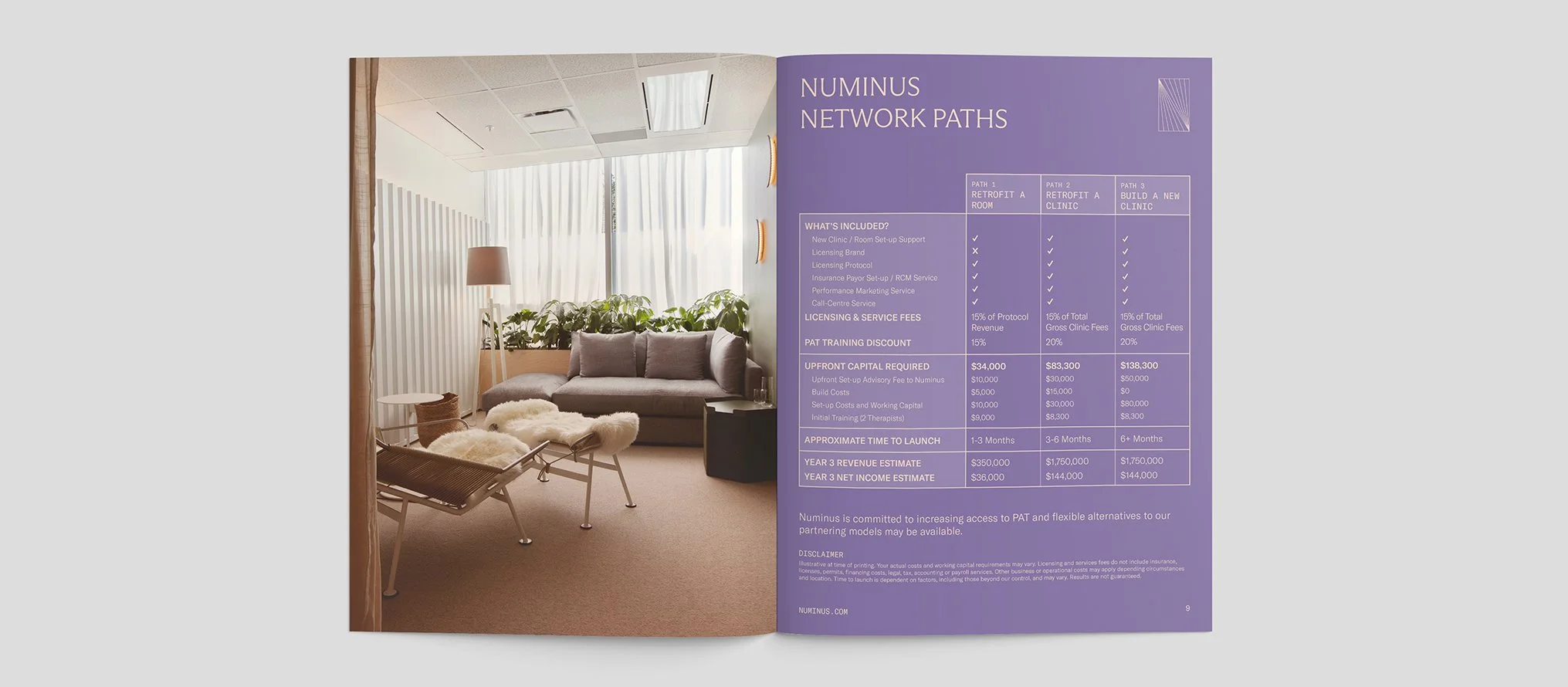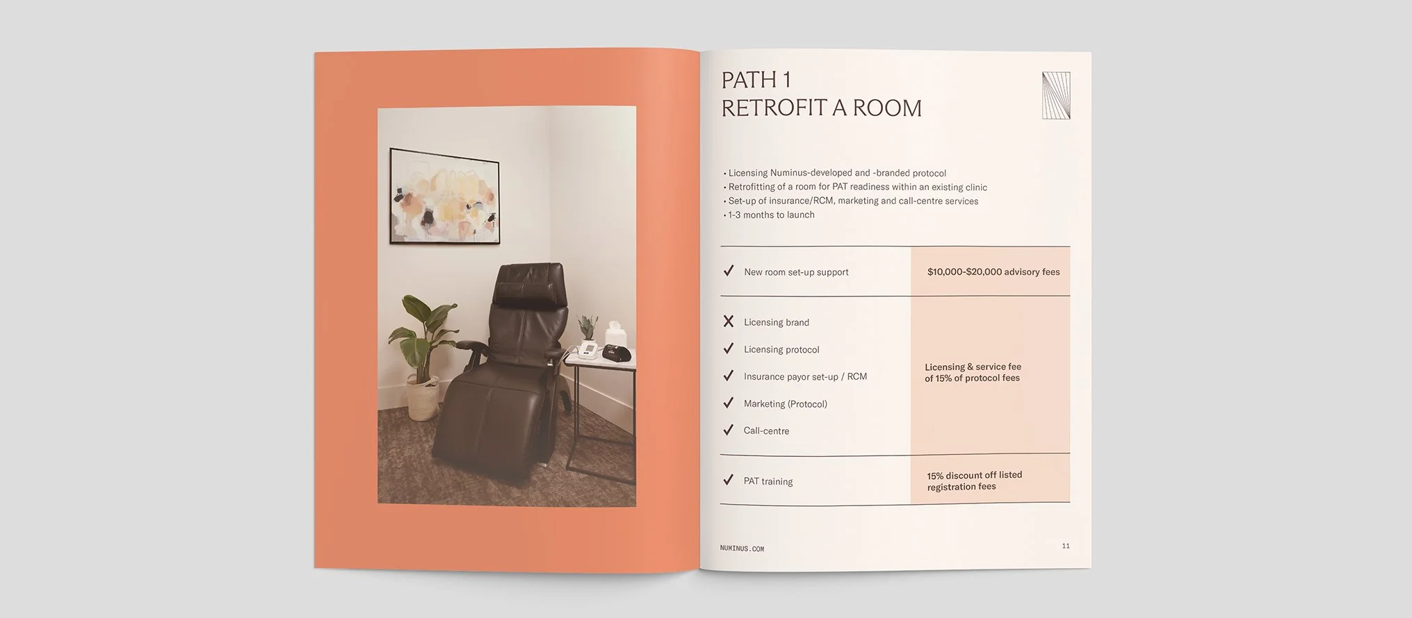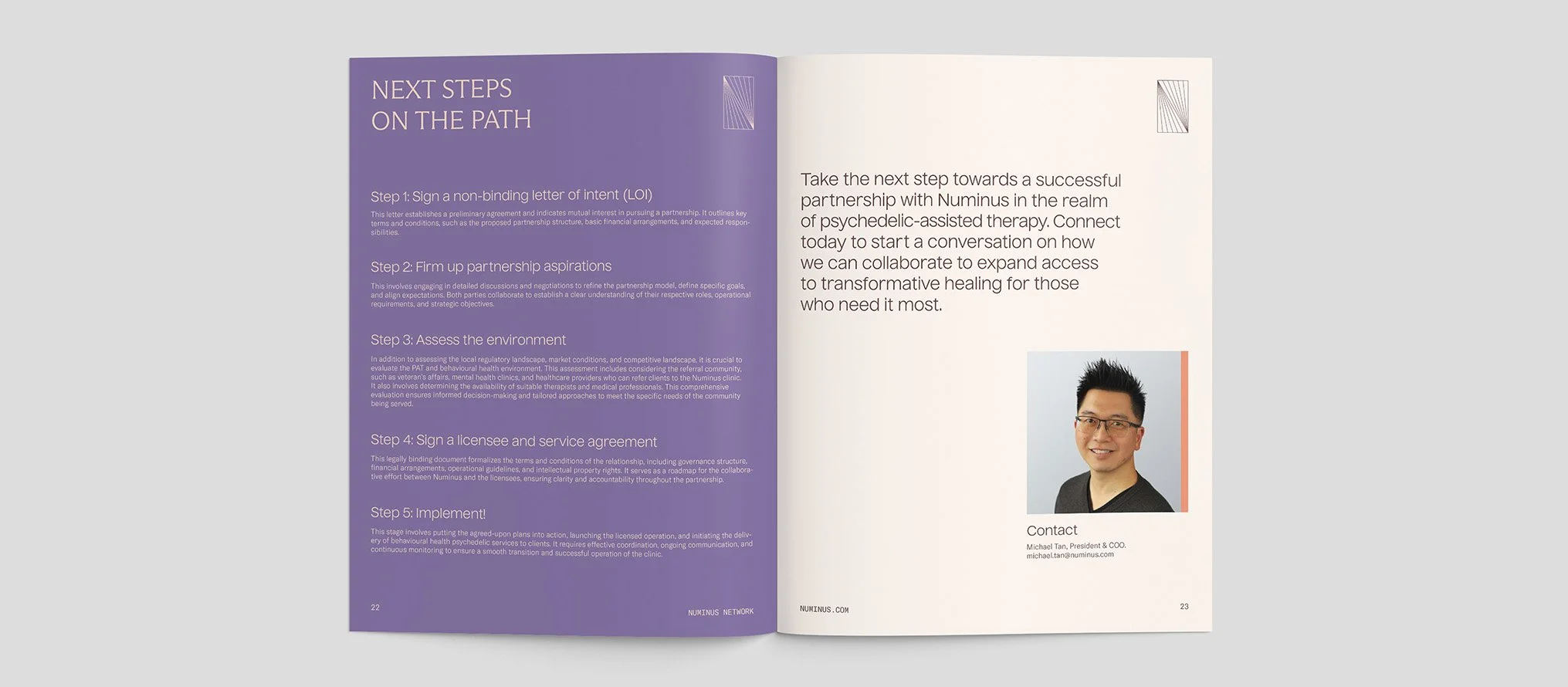 A guidebook created for clinic owners and practitioners interested in partnering with Numinus. The guidebook needed to represent the Numinus brand while also appealing to practitioners. This was achieved by incorporating visually engaging colour pops using the brand's vibrant palette, balanced with clean, editorial layouts to maintain a professional and approachable tone.